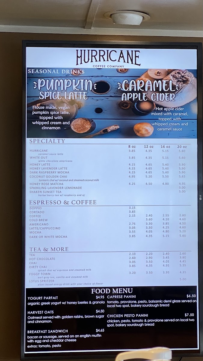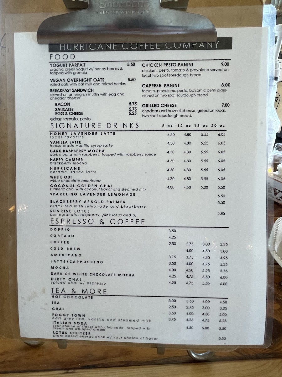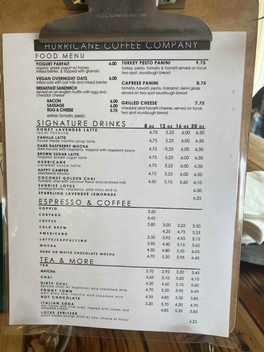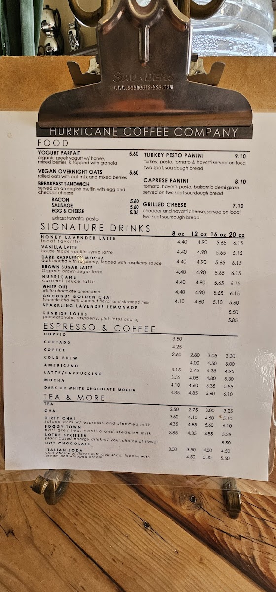 The menu at Hurricane Coffee Co offers a thoughtfully curated selection of comforting drinks and casual bites, perfect for a laid-back morning or a relaxed afternoon break. You’ll find a range of coffee favorites—from rich espressos and creamy lattes to refreshing iced brews—alongside unique choices like a honey lavender latte and seasonal specials that invite a quiet moment of enjoyment.